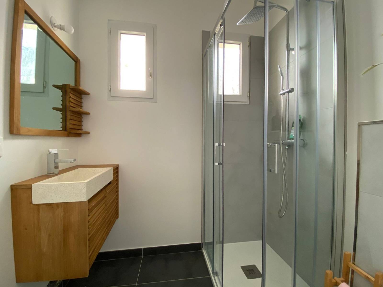 - Pose des éléments sanitaires : receveur de douche, colonne de douche, paroi de douche, meuble salle de bain, miroir, applique, mitigeur, et accessoires