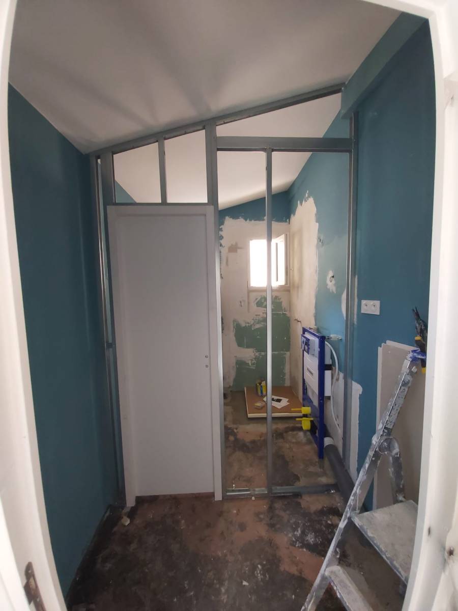 - Création de cloison sur rail ep.7cm avec revêtement plaque de plâtre BA13 hydro NF, isolation laine de roche, intégration d'un bloc-porte, bandes de calicot, cloison de L.160xH.260 surface 3m²