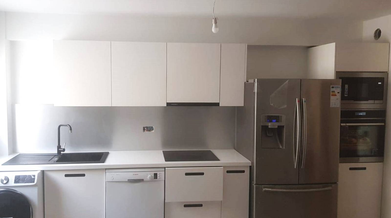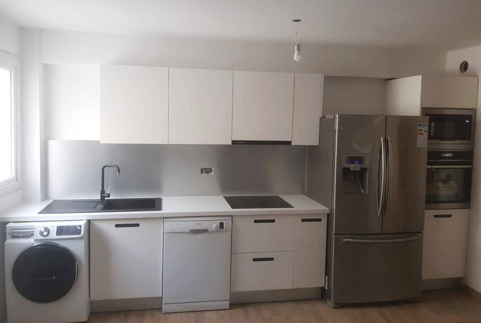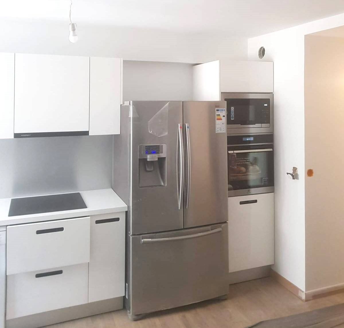 - Fourniture et pose d'une cuisine finition laquée blanche avec poignées encastrées, évier sur-plan et robinetterie et pose des électroménagers avec raccordement de plomberie et branchements électriques