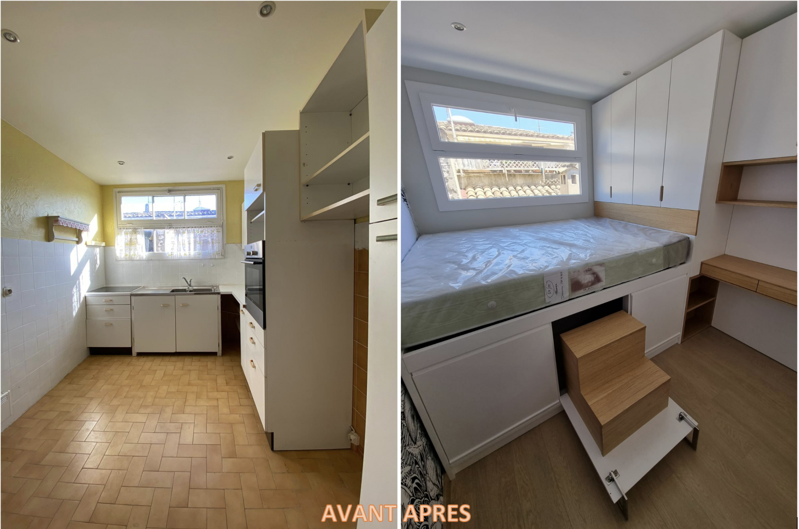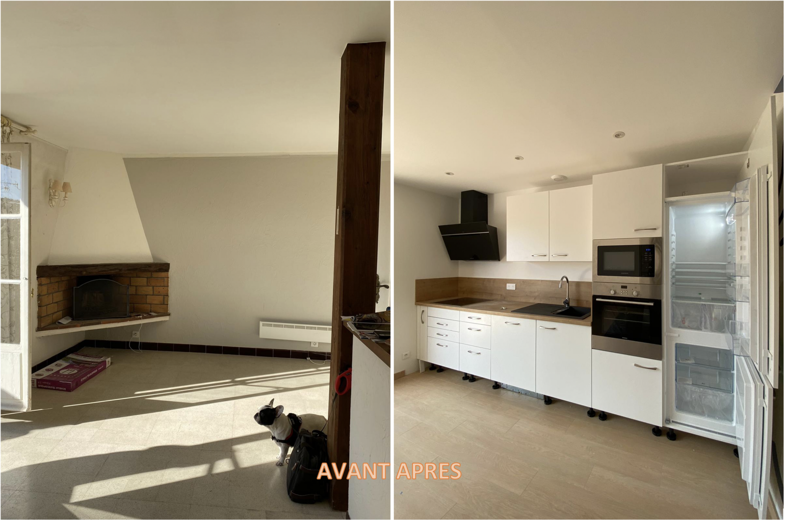 Nos équipes spécialistes dans tous les corps d’état (maçonnerie, électricité, plomberie, faux plafond, peinture, revêtements de sols, menuiserie, etc.) ont réalisé ce chantier en quelques semaines. Ils ont effectué la démolition, et la dépose de tout l’existant, des éléments de la cheminée, WC, des portes, des corniches décoratives de toute l’ancienne cuisine qui sera transformée en chambre, de la faïence de cuisine, du carrelage au sol de la salle de bain des meubles…