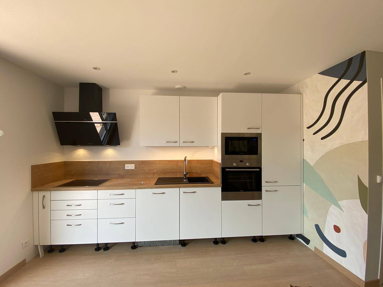 - Fourniture et pose de la cuisine modèle Lisa blanc pur avec électroménagers : Frigo encastrable ELECTROLUX, Lave-Vaisselle encastrable ELECTROLUX, Hotte décorative de 90 cm SAMSUNG, micro-onde SAMSUNG, évier et mitigeur et LED en dessous de meuble supérieur.
