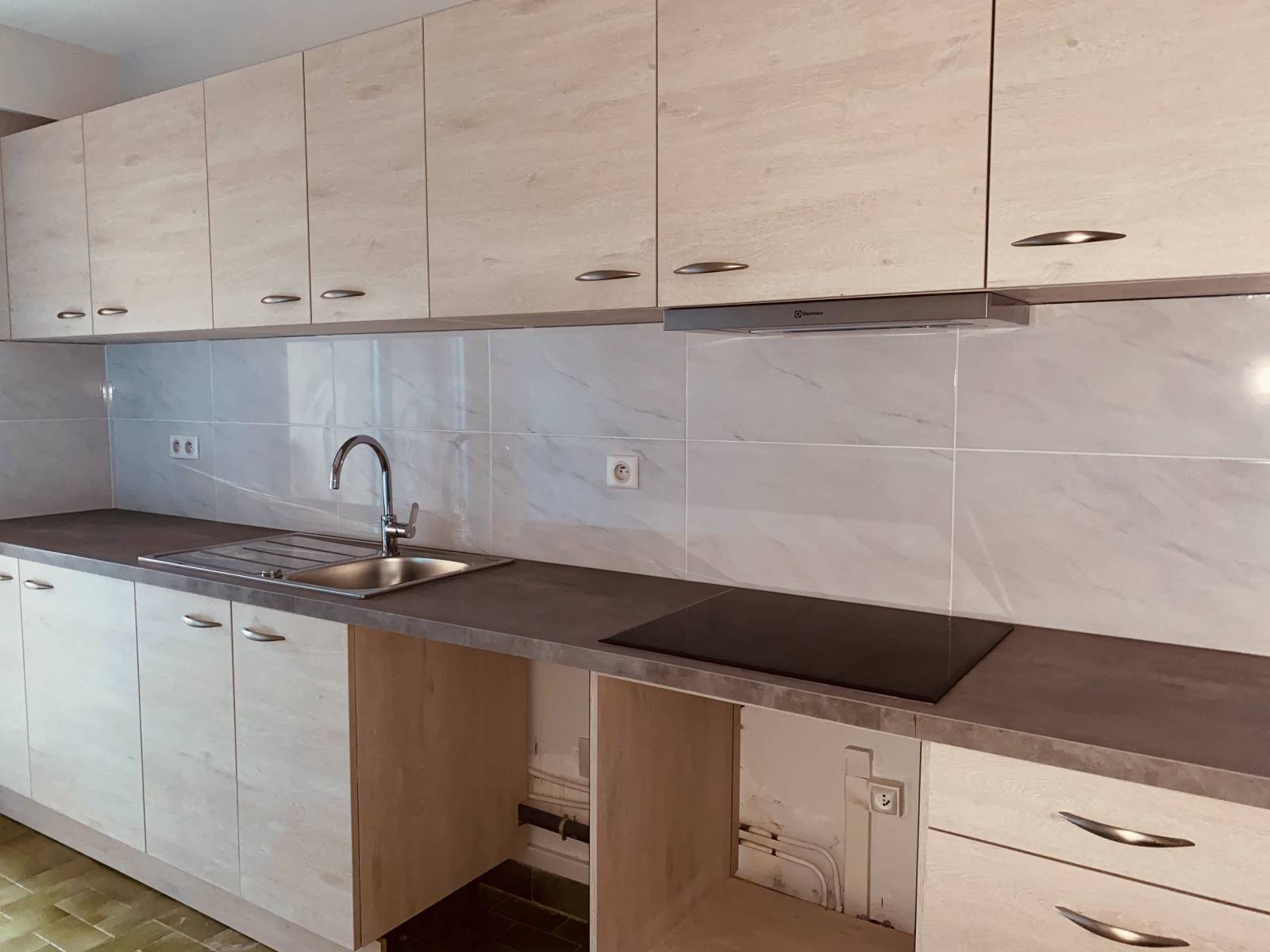 - Fourniture et pose d'une hotte tiroir, d'un évier et mitigeur