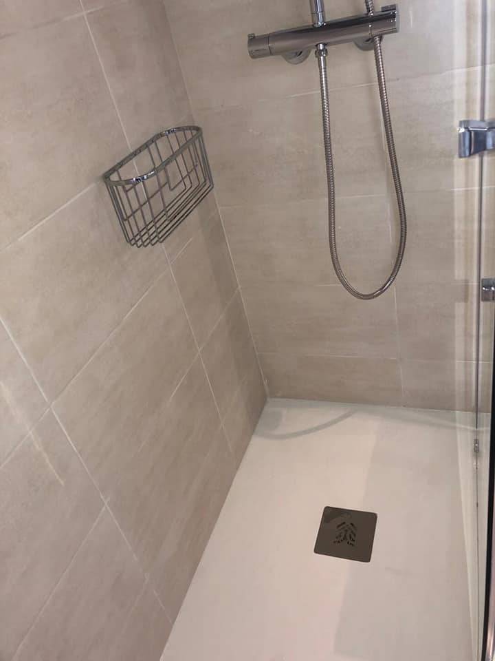 La surface murale de 18m² de cette salle de bain a été intégralement recouverte de faïence rectifiée de dimension 25x45, le sol a également été carrelé sur une surface de 4m². Une paroi de douche coulissante en verre 150x190, modèle X60, a été fournie et posée, ainsi qu'un ensemble de douche complet thermostatique NINE Ref: 98 761. Le receveur de douche modèle Stone de 70x150x3cm couleur blanc avec bonde d’évacuation extra plate et antiodeur a également été installé. Le coût facturé pour ces travaux s'élève à environ 5 500€ TTC.