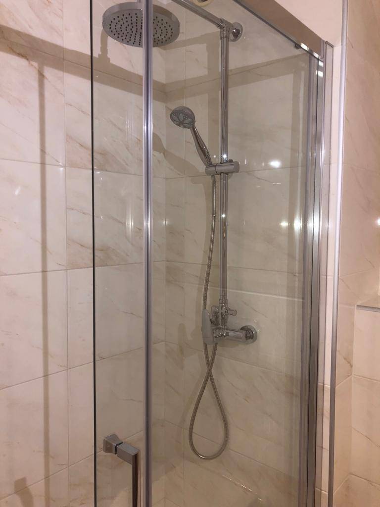 - Fourniture et pose des éléments sanitaires : robinetterie, mitigeur, contrôleurs de débit d’eau, paroi de douche coulissante en verre sécurité de 6mm transparent