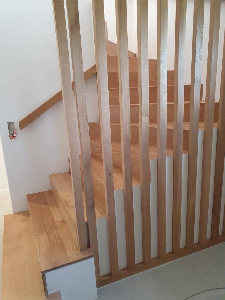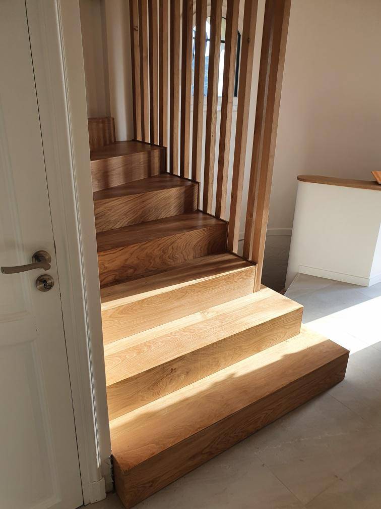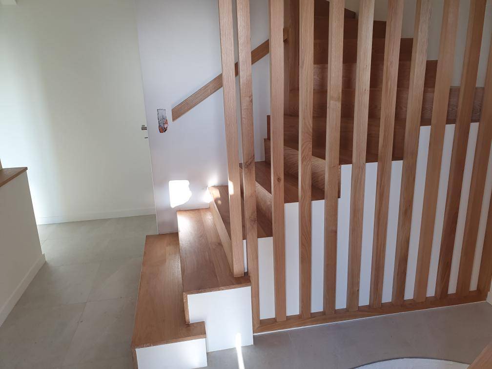 - Fourniture et pose d’un habillage d’escalier 2 quarts tournants réalisés en chêne massif rustique d’épaisseur 24cm, 17 marches et contre-marches, garde-corps en forme de claustra section 50x30 de H.170cm et L.150cm sur 7mL de main courante section 7x5 murale. 10mL de main courante posée en applique sur le muret existant L.900xEp.5cm. Finition 2 couches de vernis naturel.