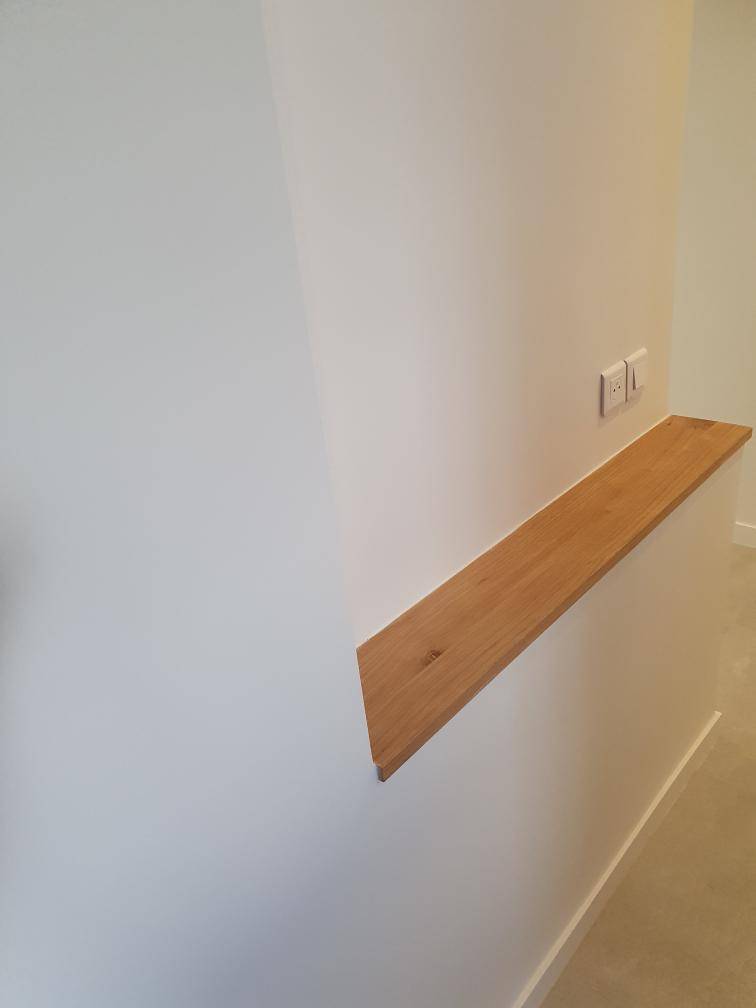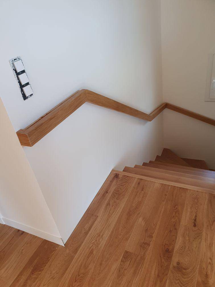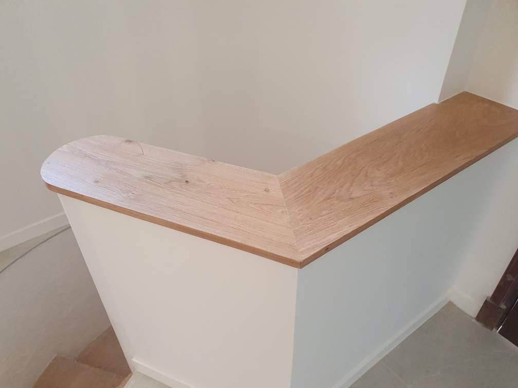 - Fourniture et pose d’un revêtement du muret de l'entrée dim. L.140cmxP.30cm, rampe du coté montant d'escalier gauche sur 130cm, poteau à l'angle et habillage du nez de muret des escaliers en chêne massif, finition 2 couches de vernis naturel